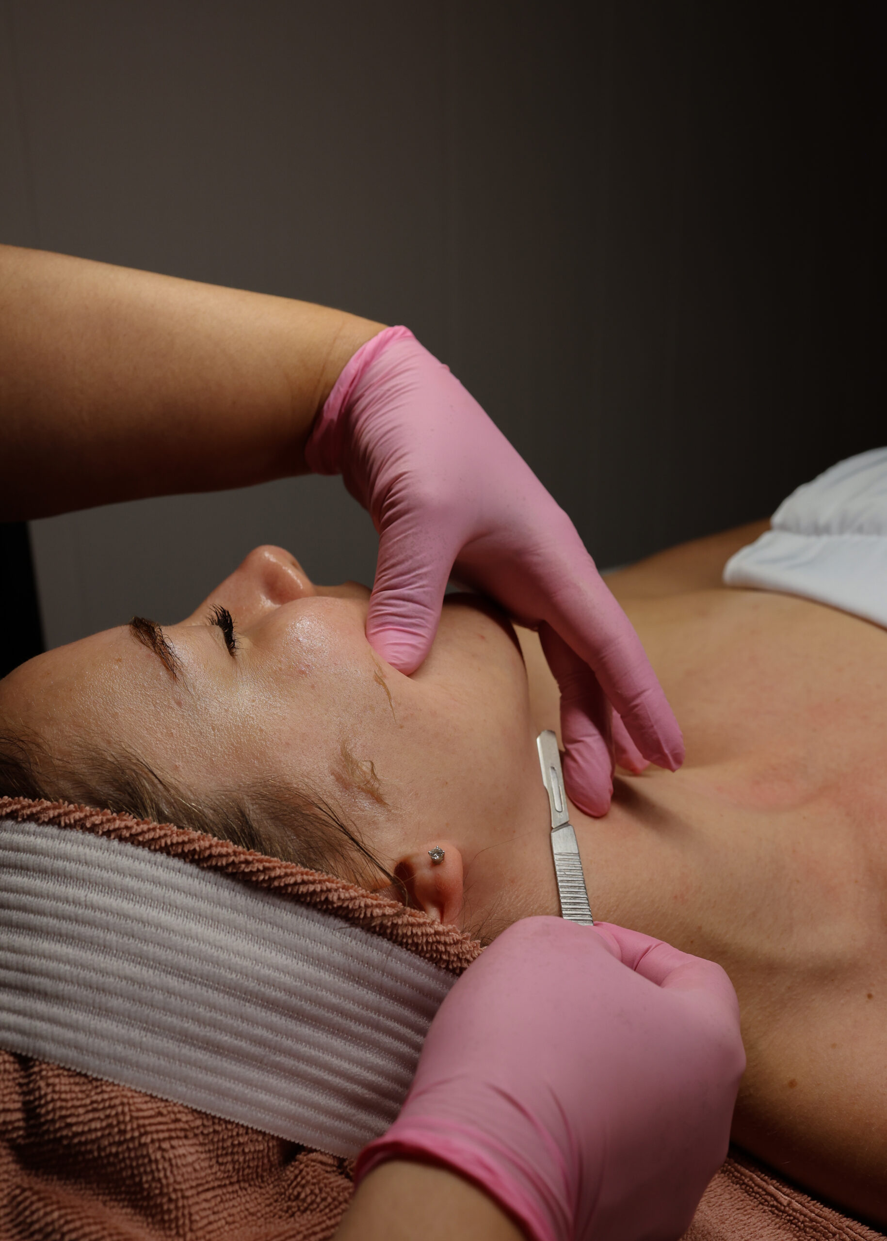 During a dermaplaning session, a trained aesthetician uses a small, sterile blade to carefully scrape away the top layer of dead skin cells and fine hair. The procedure is performed at a 45-degree angle to ensure a gentle, effective exfoliation. The treatment typically takes about 30 minutes, and there’s no discomfort or recovery time involved. After the treatment, your skin will feel instantly smoother, and you’ll notice an immediate improvement in brightness and clarity. Dermaplaning is often paired with other treatments, such as chemical peels, for enhanced results.